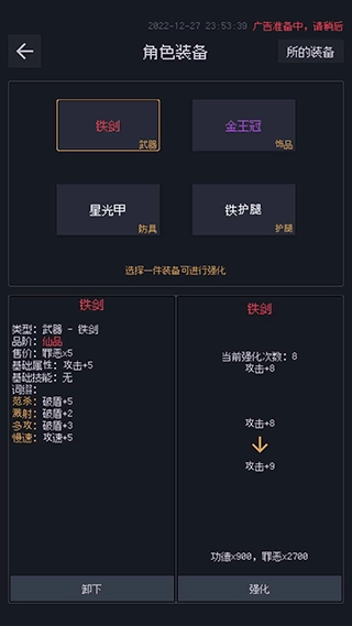 装备方面,铁甲铁护腿可以少量刷取,可以多刷铁剑。在首页可以将装备锻造升品,相同品质的可以二合一升级。白色升级到绿色会随机赋予词条,之后升级的词条是从作为合成材料的装备中抽取。铁剑的词条以加速最好,护腿词条以复苏(护盾回复速度+9)最好,防具的词条都比较一般。
