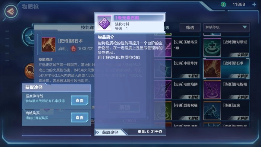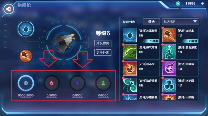 另外,需要注意的是在经常使用技能后,新手会发现技能无法使用,那是因为你的元素不够了。打开物质枪界面,就会发现不同元素有不同的数字,这个数字等于就是蓝量,每次使用技能的时候都会对它进行消耗,当耗尽的时候就无法使用技能,所以在副本战中需要合理的分配技能的使用。