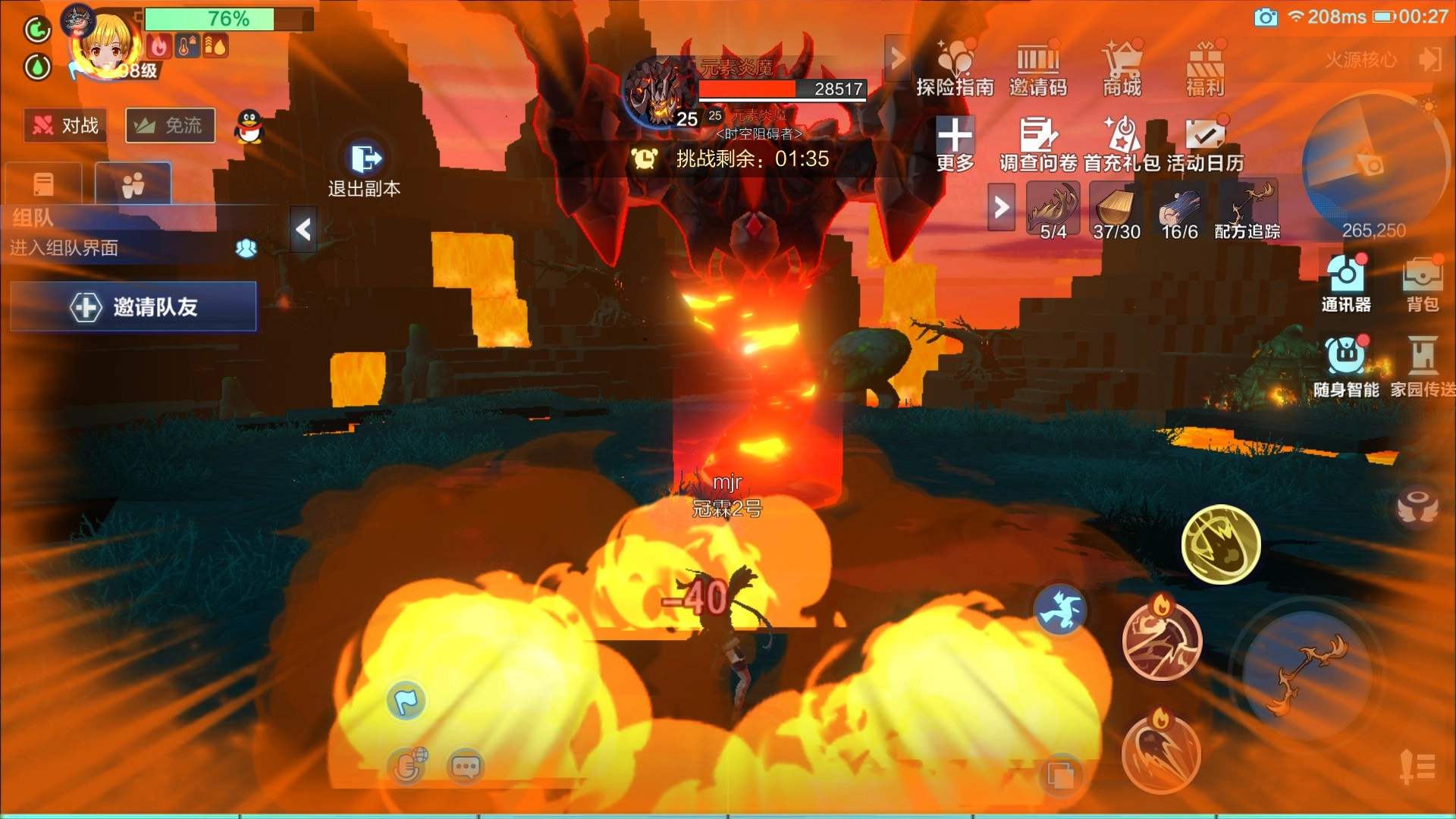 元素炎魔进入等级是25级-99级,挑战时间为5分钟,玩家需要在5分钟的时间内击败Boss,通关之后只需要退出副本即可
