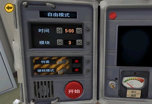 2、在设置界面中,设定爆炸时间、模块类型、特需条件及是否开启硬核模式,完成后点击“开始”;