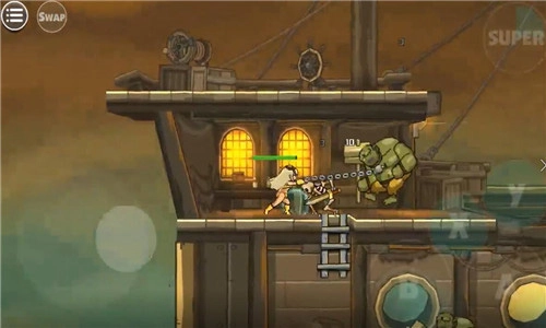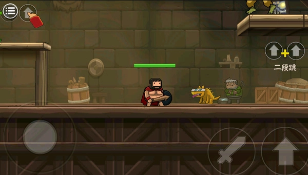 之后选择完人物我们就要开始闯关生涯了。采用虚拟遥杆的操作,左侧是上下左右的控制键子,因为虚拟所以没有显示哦,小编玩着玩着之后发现,虚拟摇杆真的蛮神奇,而且可以用盾牌挡住自己进行下蹲,之后的关卡可离不开这个操作噢,抵挡各种不明飞行物的最好方式就是蹲下。这个A则是攻击键子,B则是跳跃键子。还有大招的释放,当然是有CD的。用这几个按键互相结合的操作打怪物简直不能再舒适了!开始的时候会左右同时出怪物,为了避免掉血,就是要看操作之间的配合情况了。可以跳跃到一方进行攻击,也可以迅速打击左侧之后再攻击右侧,速度是一切的前提。