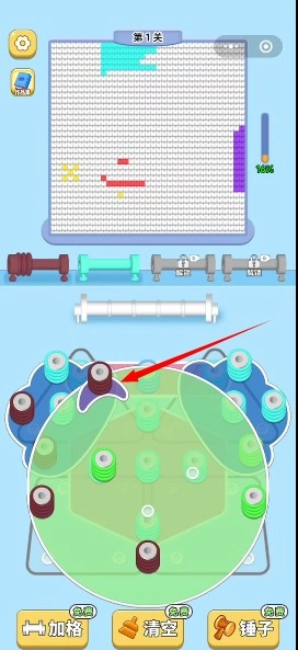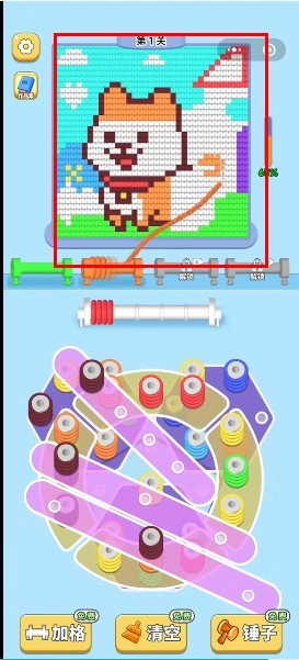 2、当柱子上缠满了对应颜色的毛线后就能自动填充到上方的拼图中,从而完成挑战。