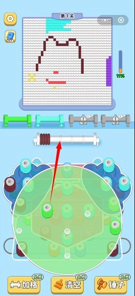 1、游戏的闯关过程分为两部分,第一部分我们需要将下方的各种颜色毛线收纳到对应颜色的柱子上。
