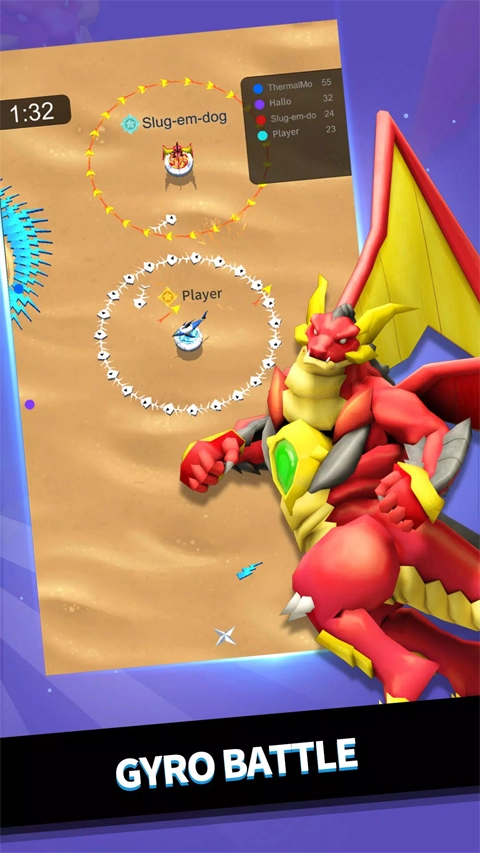 魔幻陀螺对决是一款以陀螺为核心元素的休闲游戏。玩家在游戏里要操控自己的陀螺参与各类战斗,目标是成长为厉害的陀螺战士。每一局游戏都会有八个陀螺同时在场,玩家需要通过移动陀螺、释放斗兽魂、拾取道具等方式,把对手的陀螺击飞出赛场,这样就能赢得该局胜利。在比赛中坚持得越久,能拿到的奖励就越多。不过要留意赛场里会刷新加速、炸弹、尖刺这类道具,得小心别被具有攻击性的道具波及到。
