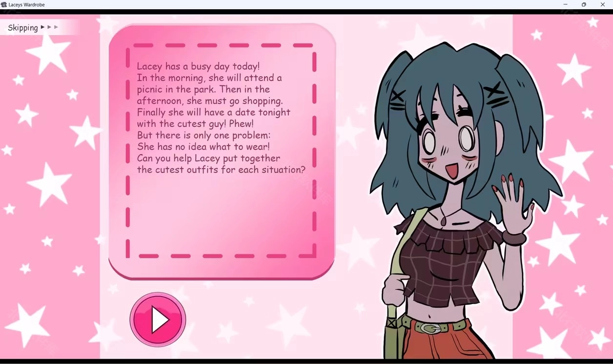 第一次打开这款游戏,首先是剧情简介:莱西一天的三个活动需换装,但不知如何选择。