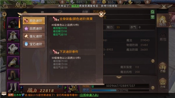 如果你问我什么装备好,那么肯定是紫装,紫装不但比蓝装多加一条属性,当你身上有5件紫装的时候可以完成“传奇之路”第四章里面的任务。当然当你分别拥有1件,6件,12件紫装的时候还分别可以获得成就,紫气东来,衣紫腰金,姹紫嫣红,并且12件紫装还可以获得紫色称号姹紫嫣红。最重要的是12件紫装会激活颜色进阶,例如12件40级以上的紫装,会增加智力,耐力,气运各110点,这都是药师需要的属性。