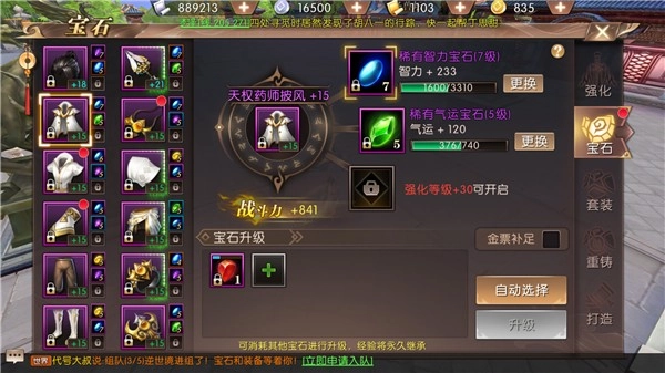 宝石选择主要就推荐耐力,智力及气运的宝石。有很多小伙伴询问是不是需要精神宝石,我个人是不推荐的,因为中的药师加血技能的CD较长,所以耗蓝量并不是很多,加上可以在系统当中选择自动吃药,蓝量对于药师并没有那么重要。但是前期缺少宝石的情况下,如果有紫色或者橙色精神宝石,也是可以先加上来增加战力,后期再进行更换。顺便提一下,吞宝石的时候,最好参考宝石进阶来吞,这样可以增加更多的附加属性。