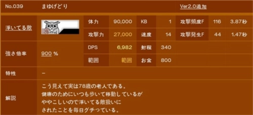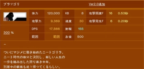 超高伤害,射程也长,攻频也不低,射程低于390的基本摸不到,量产炮灰一击死,大多数人在打大狂墙时都没有能真正稳住的炮灰,不过,经过测试60来级满生命本能加体力联组的拉面王是可以抗住一下的,有能力的可以试一试。回到正题,变态的血量是塔的两倍多,可以尝试偷塔,若要正攻,主力大猫射程最好要在440往上,这关对大狂墙的击退尤为重要,1kb意味着没控制的话它到死都不会退后一步,所以推荐使用狼女等有效击退角色,配合狙击效果更佳