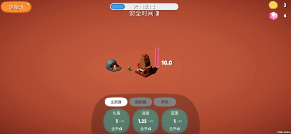 2、获得的金币将主武器伤害提升到40.7,速度提升到12.25,范围提升到6.55