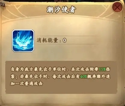 刻印技能-潮汐使者:自身为我方最先出手单位时本次攻击附带15%伤害,非最先出手时每次攻击后有40%概丰额外追加一次普通攻击。刻印技能开服20天后激活英雄刻印开启