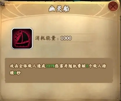 专属技能-幽灵船:消耗能量1000,攻击全体敌人造成237%伤害并随机眩晕2个敌人