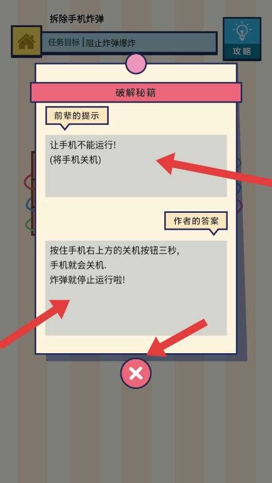 3、拆弹时手机连接着TNT,有倒计时限制,若没思路,可点击攻略按钮,获取拆弹的方法提示。