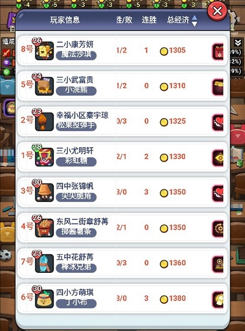 5、玩家可以在界面上方点击查看每位玩家的经济及战况信息,了解每一位对手的特性,更好的选择天赋对付他们。