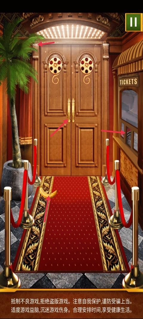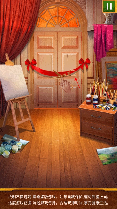 根据提示用剪刀将红丝带剪断即可开门。