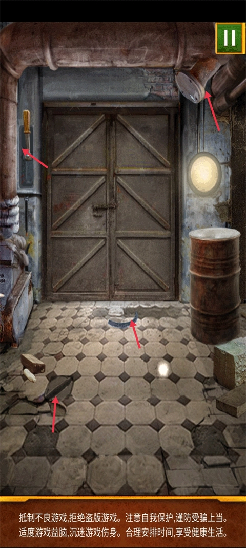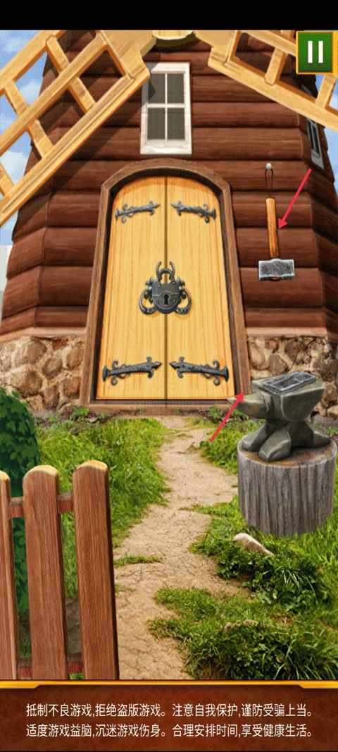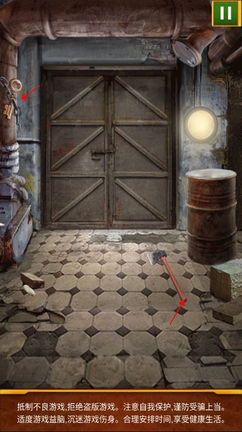 将地上的碎铁全部放到红色箭头指向的位置,并用斧头不断捶打获得钥匙打开门。
