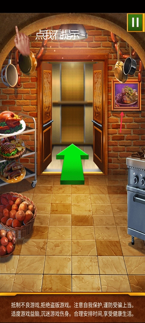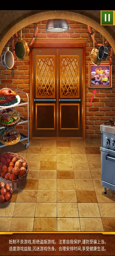 选择右边墙上的画,将它拼成牛排即可开门。