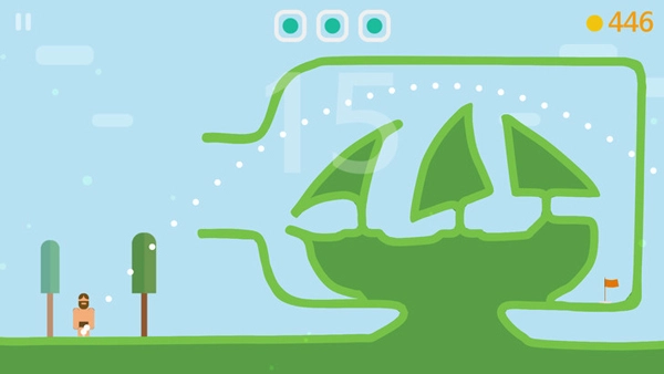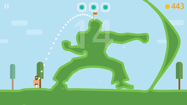 由于有一些关卡都比较简单,所以小编也就挑几个有意思的关卡来说。比如说这个14关卡,这个关卡是一个人形的绿色的什么鬼东西在打拳,然后那个旗帜在他的头顶上。其实这种观点是最好过了,只要用白线,对着他头上的那个旗帜,然后一个空投就进了,还能增加一次机会。