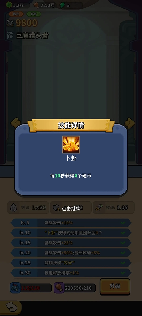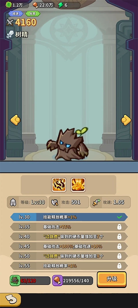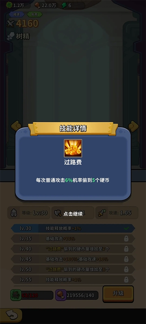 “树精”的技能是每次普攻6%的几率获得5个银币。