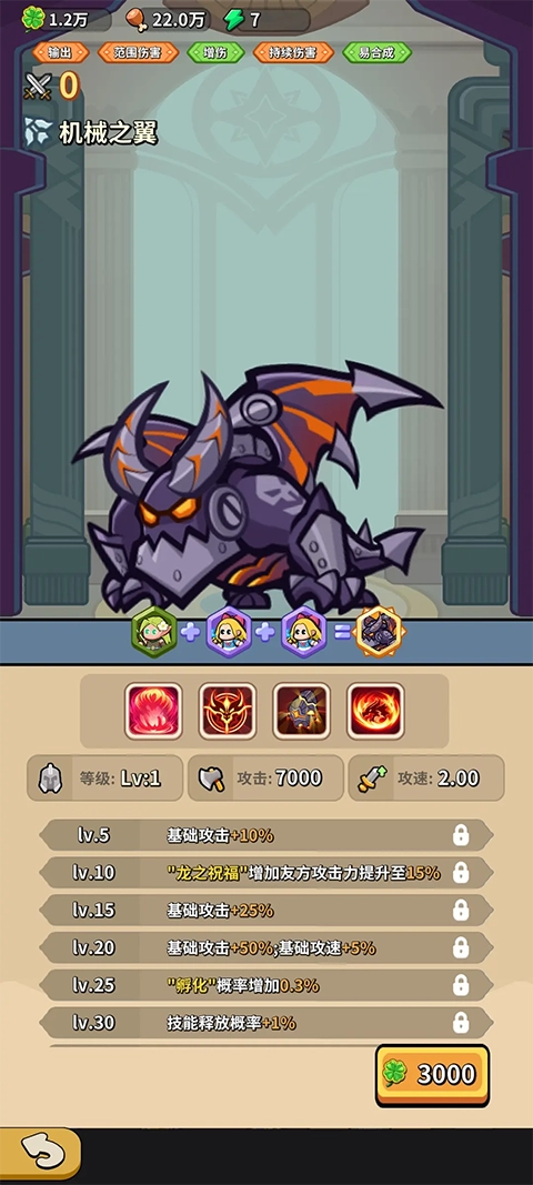 注意!(带有控制技能的英雄尽量不要放在门口,建议放到1-3/1-4) 以免BOSS卡在门口错过最佳击杀时机。这个游戏是不能叠伤的,所以机械之翼并不像领主里的龙可以多做几个叠伤害。