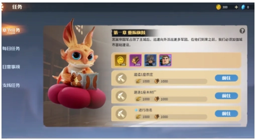 1、章节任务:按照章节任务的完成条件,有序升级、解锁建筑,确保游戏基础玩法能照常展开;同时完成章节任务可获得大量资源并解锁高级单位,有助快速提升战力;