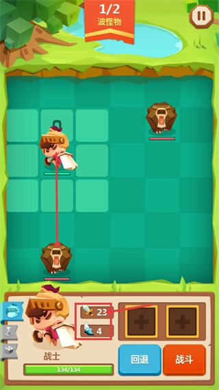 2、战斗时关注【1/2-波怪物】,利用战士【23-攻击】【4-速度】的属性,瞄准怪物布局后准备进攻。