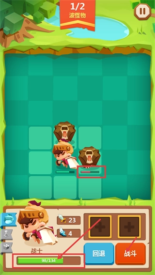 3、战斗中留意战士血量【98/134】,在【1/2-波怪物】阶段,点击【战斗】按钮持续推进战局。