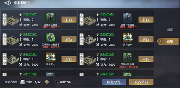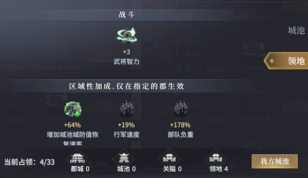 区域性加成,此种类型的军团城池在对应的郡内,玩家城池或行军部队可以获得属性效果