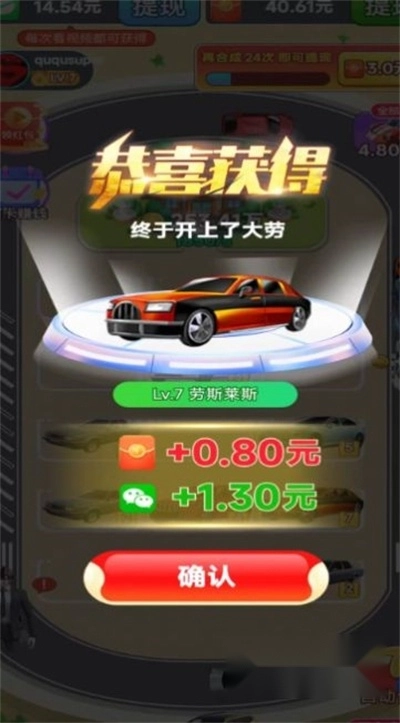 2、通过合成豪车并升级,赚取各种奖励,包括红包、金币和钻石,解锁更多高级汽车;