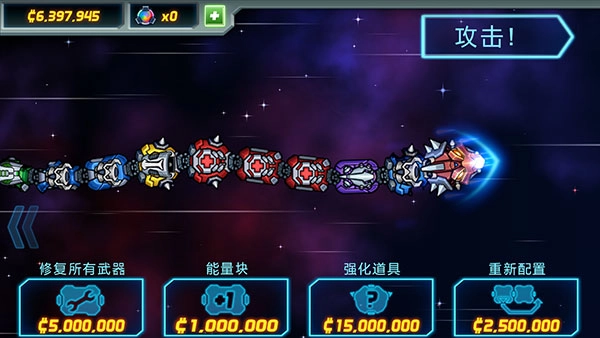 5、不断收集屏幕中出现的各种颜色的机器部件并将它们组装到巨蛇的身体上,当然不能是简单的组装,不同颜色的部件可以相互配合并产生出不同的攻击效应。