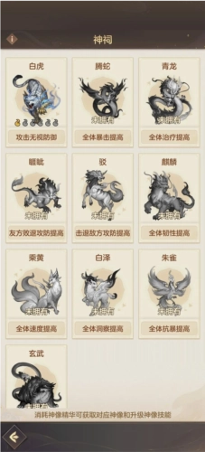 主城的神祠共有10个神像,每个神像都会为队伍提供最终法伤、物伤、物免、法免、洞察、韧性和速度等加成。此外,每个神像都有独特的技能效果,这些效果将在战斗中发挥关键作用。神像的组合效果也是相当重要,玩家在队伍中上阵相同阵营的英雄可以激活额外的收益。