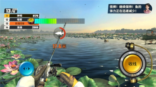 5、钓到鱼后点击收线,当鱼力竭后即可成功钓到;
