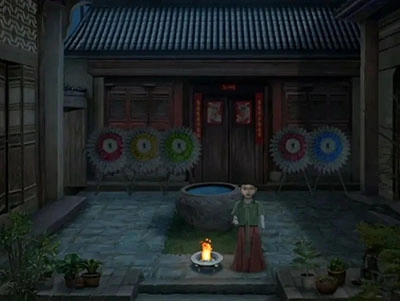 还是先搜刮,左上角树枝堆里拿到柴火,右下角的竹筛子里拿到木炭,左边的灶台下面拿到一盒火柴和草木灰,顺手把柴火放在上层,然后使用火柴点燃柴火。左上角的一排抹布颜色和外面花圈一样,所以调整一下顺序红黄绿红蓝拿到一把钥匙,查看一下右上角的柜子,男主已经提示了用刀割开就行,剧情后查看柜子的左下角使用钥匙果然拿到菜刀,那么对上面柜子使用菜单就拿到面团了,查看一下左边灶台上拿走木盖子放入面团,然后切换一下场景回来就能拿到米糕了。