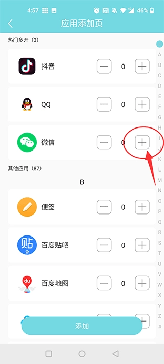2、然后找到微信,选择微信后的+号,数量由你选择;