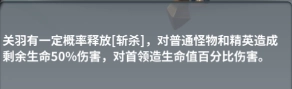 关羽的定位是一个破坦手,这里的坦是指战场中的精英和BOSS,关羽由于自身附带的高额攻击,在前期就有不俗的输出能力,而【斩杀】技能更是使得关羽在BOSS关的表现十分强力,【斩杀】可以对普通怪和精英怪造成当前生命50%的伤害,对BOSS造成生命值百分比伤害。