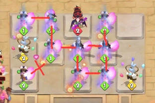 这套阵容是前期比较适合新手过渡的组合,虽然队伍组成是普通卡和史诗卡,但在游戏里,部分普通卡也是非常好用的,这套阵容可以安稳的度过战场前中期,通过费萨尔的致残和林德的减速,再搭配有神器的妲己,可以让怪物在出生时就动弹不得,再以妲己连携共鸣补充单体伤害,山鲁左德负责AOE伤害,再使用幸运史莱姆快速升星