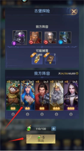 3、进入关卡前会有敌我阵容,以及可能掉落的奖励,使用能量瓶开启;