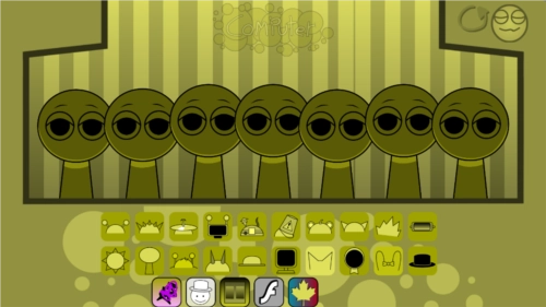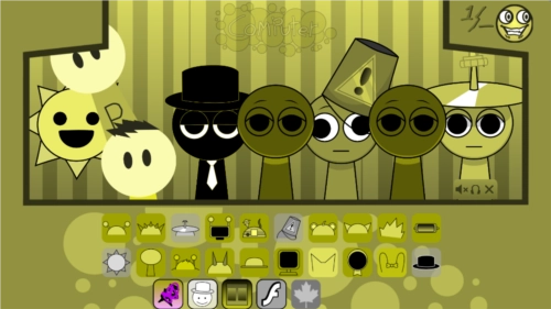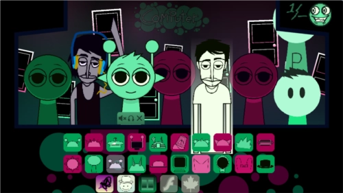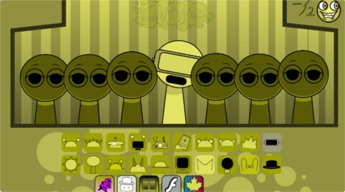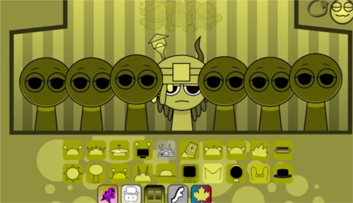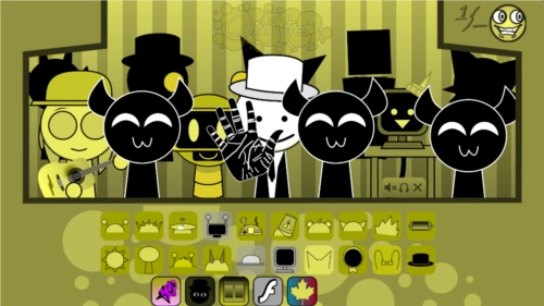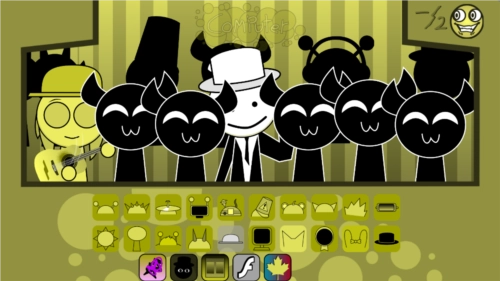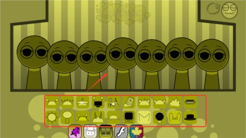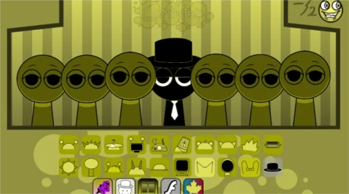 3、sprunki模组特色是恐怖模式,把最后一个帽子拖到第三个角色头上,画风突变,就进入恐怖模式了