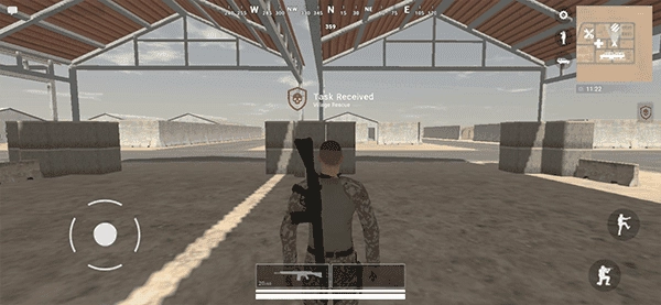 4、在游戏中利用左下角摇杆操控角色移动,点击枪图标即可使用。