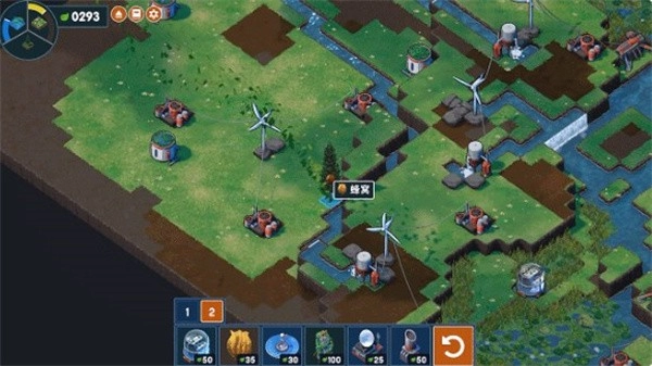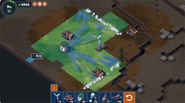 10、在玩家开拓了不少土地后,就能解锁建筑水泵,水泵必须要建设在有绿色资源覆盖的沟渠边上,这样才能把水引进河道;