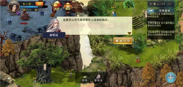 这次我们需要去封魔山雾灵山找廖耶延(60.25)医治小小,需要10个蜈蚣,1个金蚕,10个百年灵芝(等待2分钟)