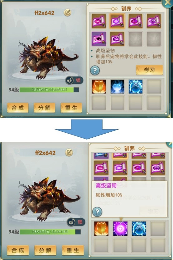 关于合成还有一个重要的点是需要玩家先考虑清楚的,也就是你需要的是多技能的宠物还是高资质的宠物,这决定了你合成的策略。