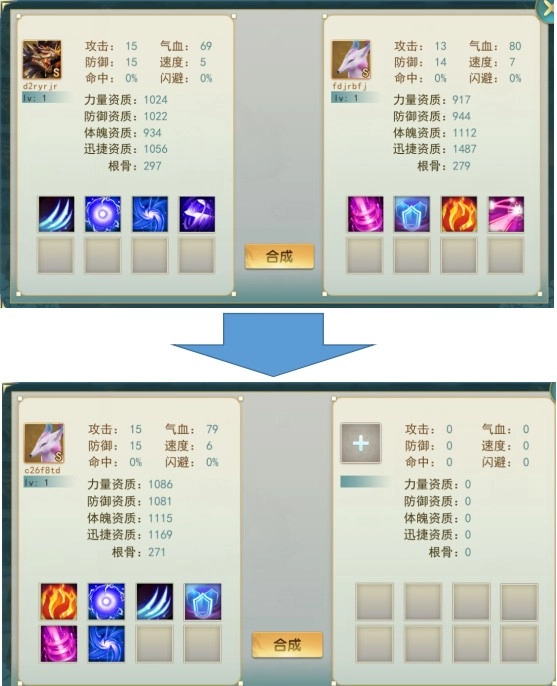 3、如是不同种的2个宠物进行合成,则合成结果的宠物各有50%几率得到合成材料的2个种类之一;