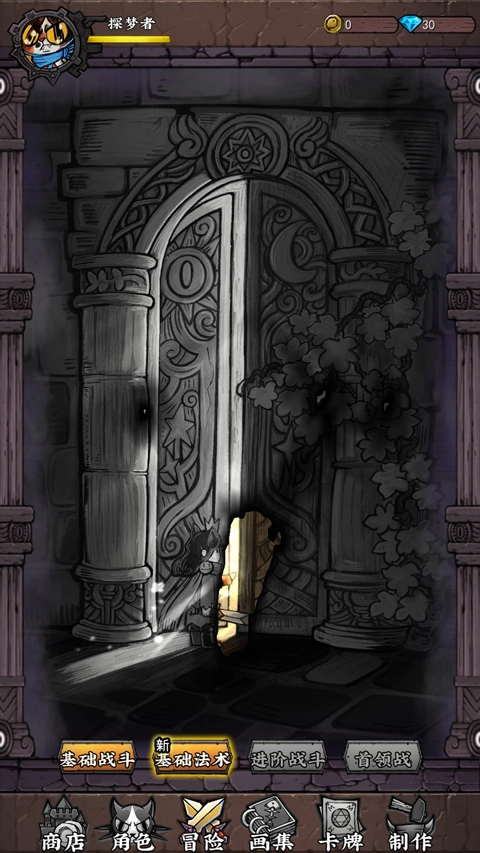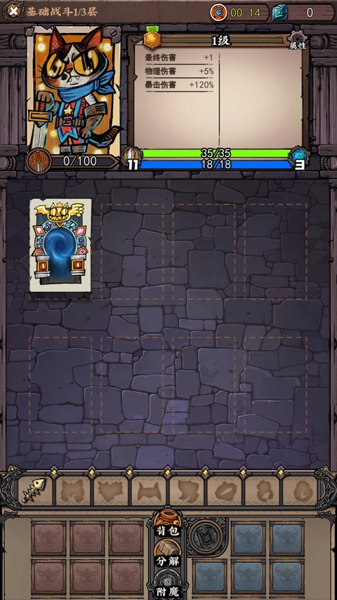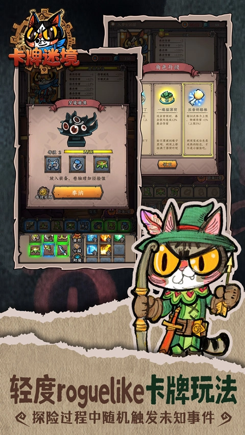 游戏中将随机获得装备和法术等道具,闯关解锁选择不同的神器,冒险途中还有各种随机事件发生,玩家需要利用自己的策略和技能来强化自己,打败猫猫怪物。