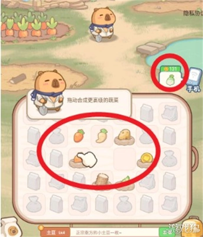 5、点击成熟的萝卜就可以充当格子里的物品,开垦更多土地去种植,就能合成更多的订单赚到金币。