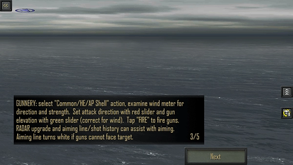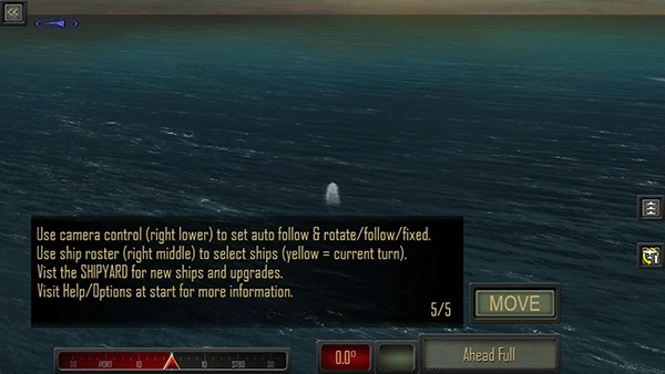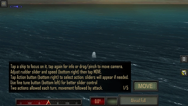1、点击一艘船来聚焦它,再次点击获取信息或拖动/按压移动镜头。调整舵滑块和速度(右下角),然后点击MOVE。点击动作按钮(右下)选择动作;如果需要,将显示滑块。使用微调按钮(左下)为更好的滑块控制每个回合允许两个动作,移动之后是攻击。