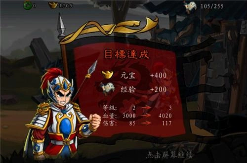 击杀12个黄巾贼的任务完成后,在击杀几个小兵,那么这关的boss先生:邓茂也就出现了,然后我们会看到这个时候,我们的大技能也该冷却完毕了,然后我们就可以像玩水果忍者一样玩boss先生了。大技能结束后,我想boss不会剩下太多的血了,普攻几下就过了。