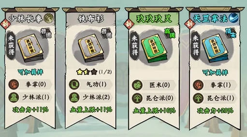 搭配思路:前10关能学习少林长拳、铁布衫、太清掌法和太清罡气;20关之前建议优先解锁新武功,先把核心羁绊效果凑出来;25关前要学会乾坤大挪移,利用它免疫怪物首次攻击的效果,之后再点出几个2星的紫橙色招式,借助峨眉羁绊的加成,输出就能直接拉满,最后再把所有羁绊效果都补齐就可以了。