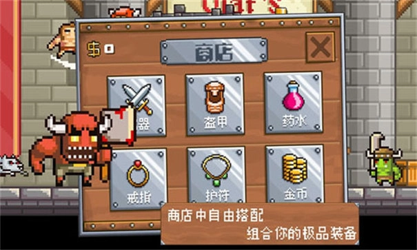游戏还为玩家们提供了一些商城道具,在这里可以购买头盔、武器、防具等等,而它们的作用就是增加玩家的血量与攻击。