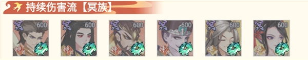 主C钟馗(钟馗有百分比伤害推图神技,被动可增加冥界神将伤害)、副C阎罗王(阎罗王有高几率的全体流血效果)、主坦克判官(受击给攻击者附带留学效果切自带带复活BUFF)、宋帝王(高额几率附加流血buff,还有稳定控制)、秦广王(高额单体点杀,击杀,击杀回复有续航)、孟婆(冥族唯一辅助、伤害反弹、恢复)。