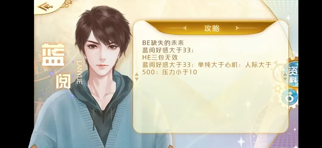 HE三包无效:蓝阅好感大于33;单纯大于心机;人际大于500;压力小于10
